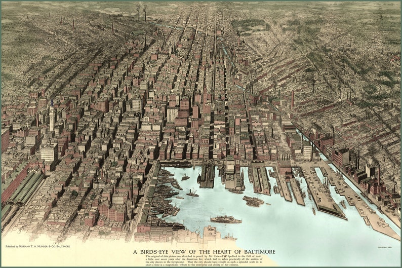 Bird S Eye Drawing Of Baltimore Circa 1911 With Many Etsy